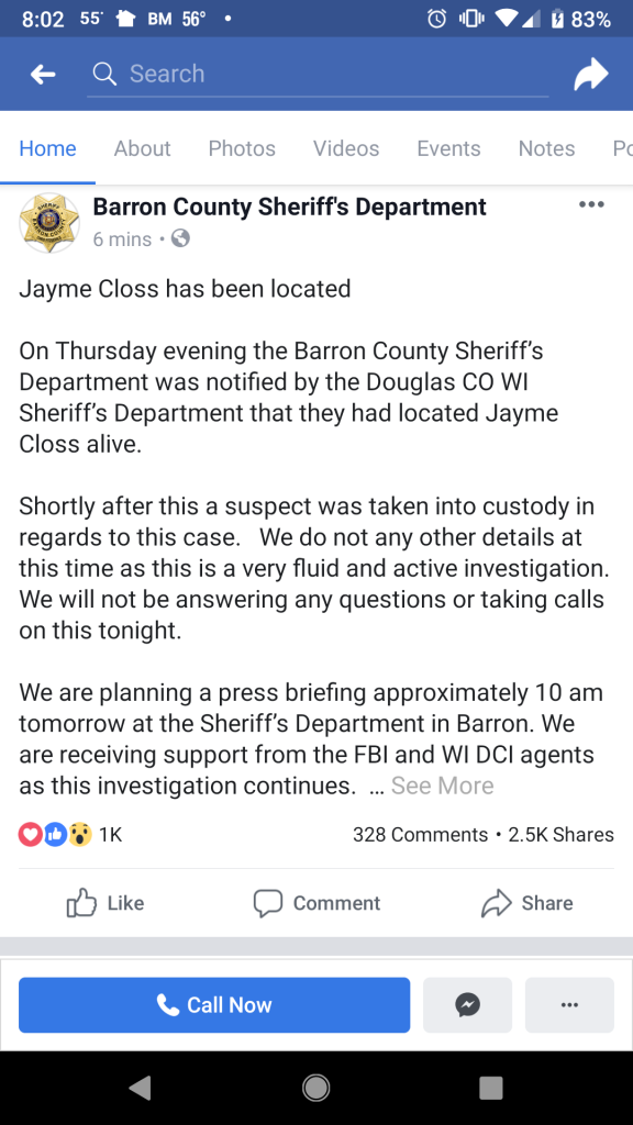 On Thursday evening the Barron County Sheriff’s Department was notified by the Douglas CO WI Sheriff’s Department that they had located Jayme Closs alive.