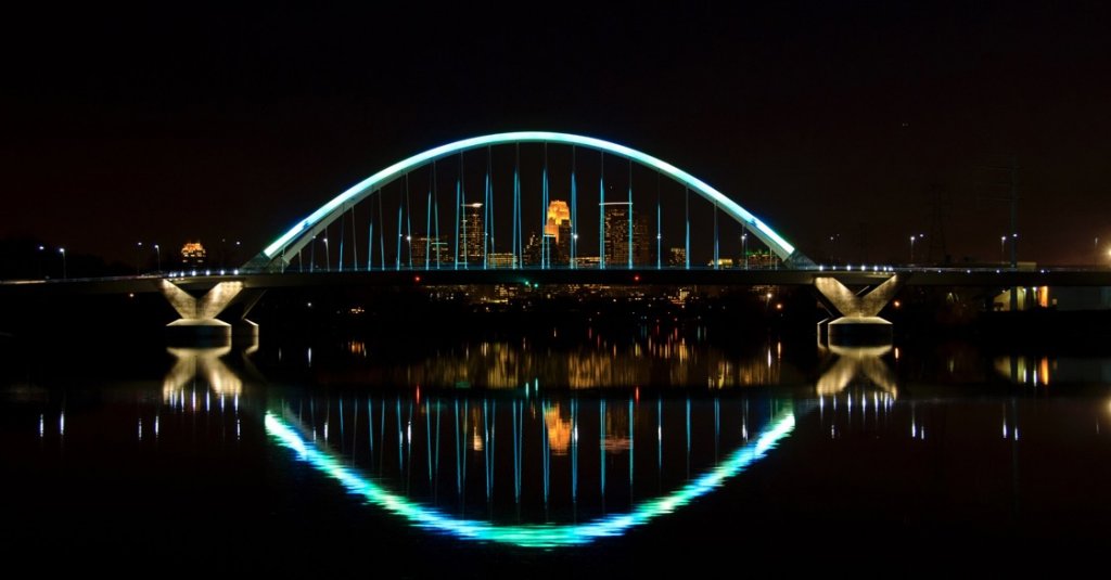 In recognition of Jayme Closs's homecoming, the Lowry Bridge is lit blue and green tonight — the same colors that the community of #Barron, Wisconsin, used to decorate a Christmas tree for Jayme while she was missing.