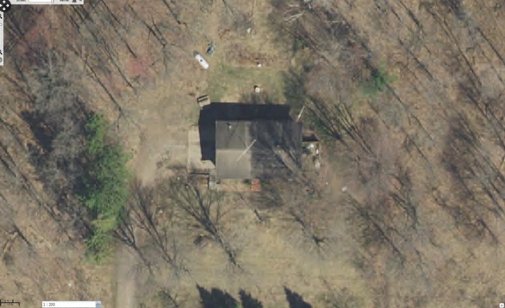 That photo has the front towards the bottom of the photo. Note a vent or fan at the upper left (left rear room). Kitchen? And a vent near the right end close to the peak of the roof, but on the rear half. Bathroom? Obviously, the front left must be the living room (entrance plus large windows).