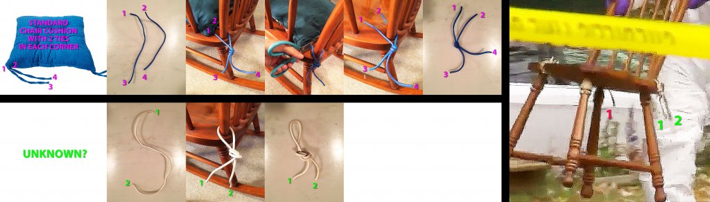 I'm probably the primary offender when it comes to the over analysis of the seat cushions. We don't have much to go on, so I've focused on something tangible. Like I said earlier I'm an avid fly fisherman and tie many different knots and flies, and something seemed off to me when further analyzing the chair. I'll apologize in advance, because here's some further testing (see attached file). You'll notice in the WCCO/CNN video thatthere's (1) tag end of rope remaining in the rear left and (2) dangling from the rear right.