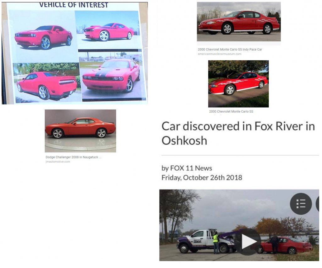 I hope this image upload works! I grabbed 3 images from Google images of both types of cars, along with the police-supplied stock images of the Challenger vehicle in question, and a screenshot of the Monte Carlo after being towed from the Fox News site. IMO, I think a 2000 Monte Carlo could be mistaken for a Dodge Challenger, depending on model. 2-door, so rear side windows are small. The hood area may not be as boxy as a Challenger's, but the rear of the cars seem somewhat similar, esp if the security camera image of what they think is/was a Challenger wasn't great quality.