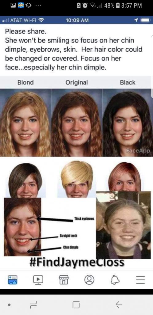 2. Face to face contact. Jayme was 13, at an age where constant supervision is not the usual mode of operation. We have previously posted our errors in judgment at that age, and that could be the case here. Did anyone see Jayme talking to someone perhaps after school, or did Jayme go to all x-country practices, per schedule? How often was she alone?