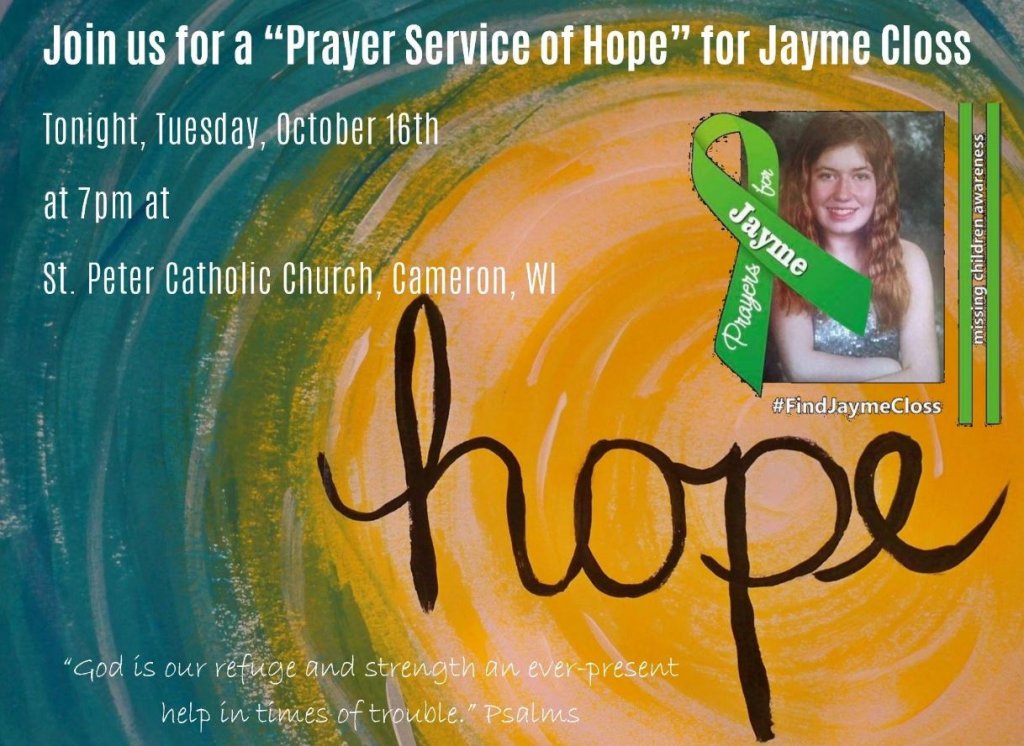 Thanks for posting I think I will join them jayme I hope you come home safePrayer Service of Hope for Jayme Closs happening at 7 o'clock tonight at St. Peter Catholic Church in Cameron, WI. This is about 5 miles east of Barron. .@KSTP