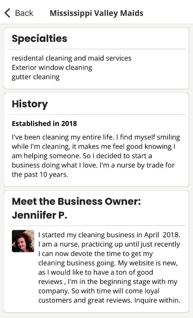 Jennifer P. has a Yelp account for a cleaning business in La Crosse called Mississippi Valley Maids