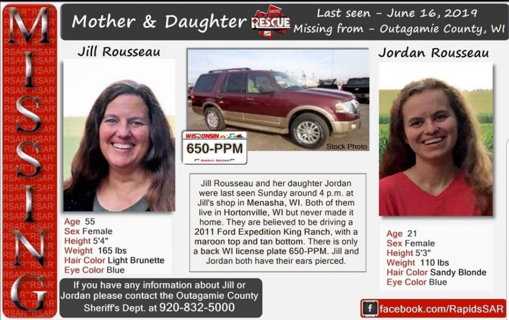 The Outagamie County Sheriff’s Office is trying to determine the whereabouts of a mother and daughter from the Dale area. Jill Rousseau, female/white, age 55 and her daughter, Jordan Rousseau, female/white, age 21 have not been seen or heard from since Sunday, June 16th. The husband and father of the two, Kelly Rousseau, is cooperating with investigators and is NOT believed to be involved with this disappearance.