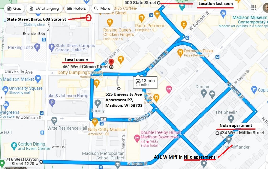 Thank you. I missed that and wasn't aware of that and added it to the map. That's even more significant than when Nilo lived at 515 University Ave in 2010. IMO, I wonder if he conned her into walking or driving her home? And how soon after that night did he move to the University Ave. apartment to distance himself from the investigation? If it was right away that would be very telling. I'm sure the police must have questioned everyone in the area of Nolan's apartment? If he was questioned during the Nolan disappearance investigation, the police aren't saying.