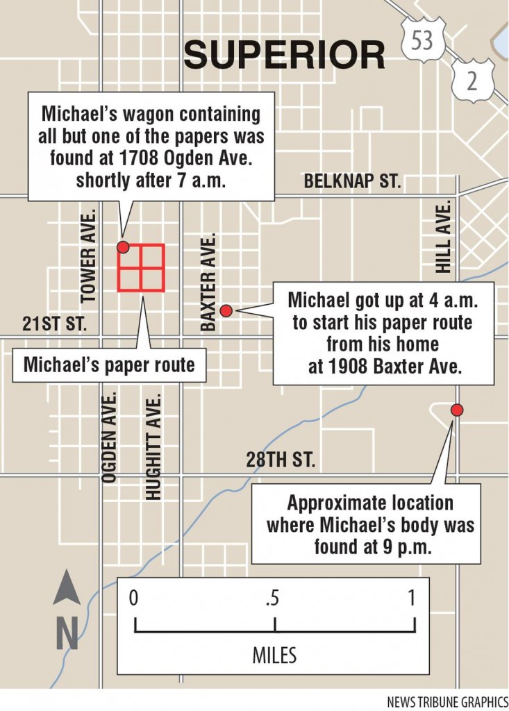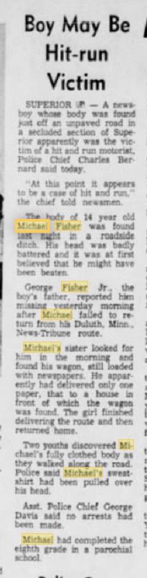 On the morning of June 19 1966, Michael Fisher prepared his wagon and set off to begin his paper route. He only delivered one paper though. Later that morning, his sister found the wagon with the undelivered papers and finished the deliveries herself. She was unsure on what had happened to him. Michael's body was found about twelve hours later; in a ditch that was two miles away from home. Michael's head was wrapped in a red sweatshirt and he was lying on his back, fully clothed. There were no signs that he was sexually molested nor any indications that a struggle had ensued. The cause of death was determined to be a crushing blow to the head and he was most likely dead before being left in the ditch.