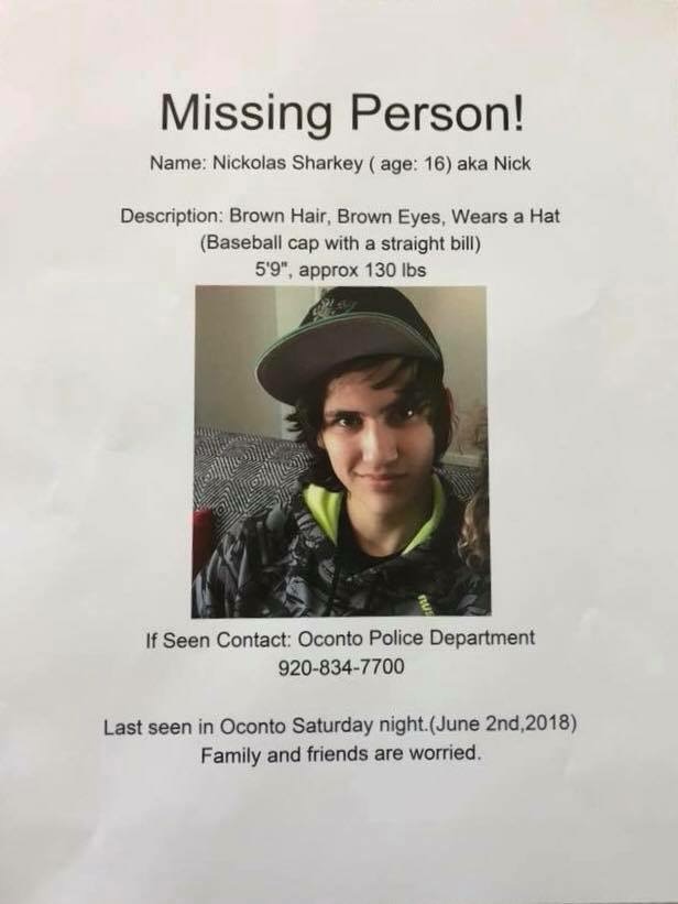 16 y/o Nickolas Sharkey of Oconto was reported as a runaway yesterday, Monday , June 4. He has not been seen since Sunday morning, June 3. Oconto PD & Oconto County Sheriff’s Office have been in touch with many people in the city and surrounding area. If you have any information that may help us find Nick & return him safely to his family, please call 920-834-6900, press 1 for dispatch.