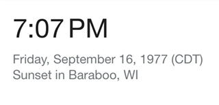 Bob left Madison at 5:30 pm (usual driving time from his home at 5025 Open Wood Way, Madison to West Baraboo, one hour via Highway 12) and was seen by the Mauston woman at 8:30 pm. It typically gets dark 6:30-7:00 pm in Sept CST.