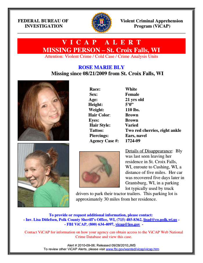 “No mother would ever hope to recognize an anniversary like the one Candus Harer acknowledged last week. A year ago last Saturday, Harer’s daughter, Rose Marie Bly, then 21, of rural St. Croix Falls, disappeared unexpectedly, leaving few clues as to her whereabouts.