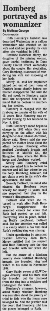 [h=3]Details of Disappearance[/h] Ruth was married to her second husband, Gary W. Homberg, at the time of her disappearance. Gary, a German immigrant, was the president of Millfab, a wood processing company in Stoughton, Wisconsin. Ruth worked for Millfab also and this was how they met. They married in 1976 and lived on forty acres of land on Leslie Road in Dane County, Wisconsin.