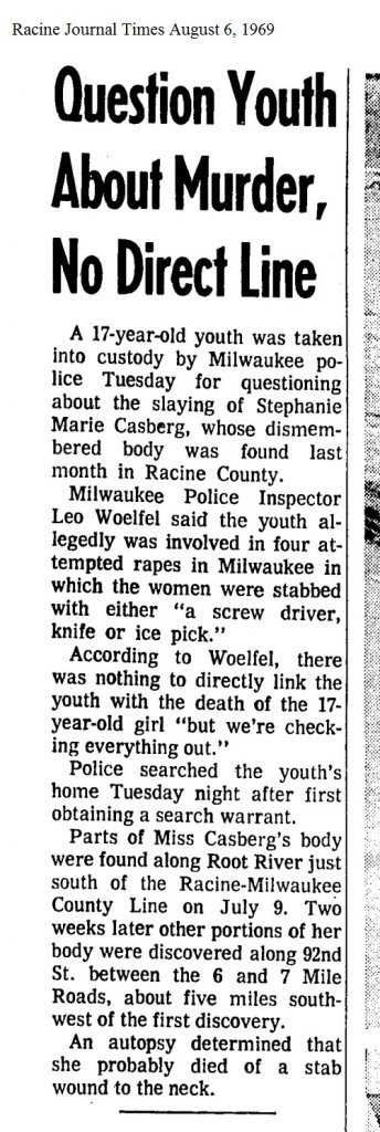 Actually seventeen year old Stephanie Casberg was murdered in Racine County. The MPD website http://city.milwaukee.gov/Police/coldcases#Cold_case_19 states she was last seen leaving work but the Milwaukee Journal states her eleven year old brother last saw her getting ready for work at 5:30 pm Monday, July 6, 1969 and was last seen by a witness getting into a yellow convertible in front of her house. She never made it to work for her 6:30 pm-12:30 am shift. She worked as a part time waitress at Marc's Big Boy in Juneau Village, 1111 N. Van Buren St. in Milwaukee, WI.