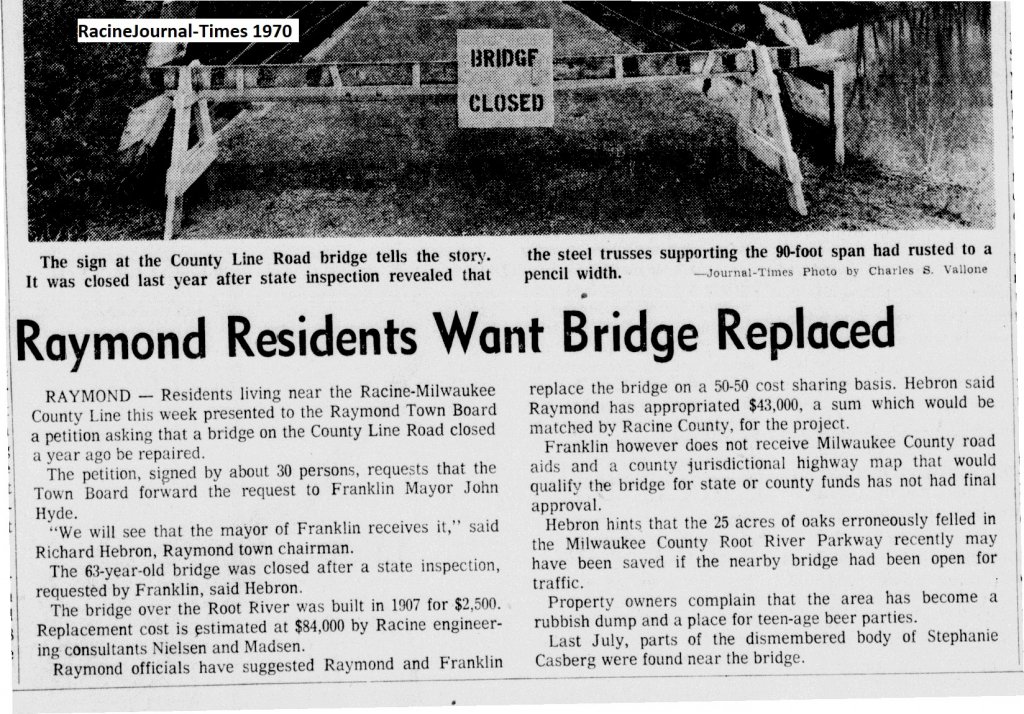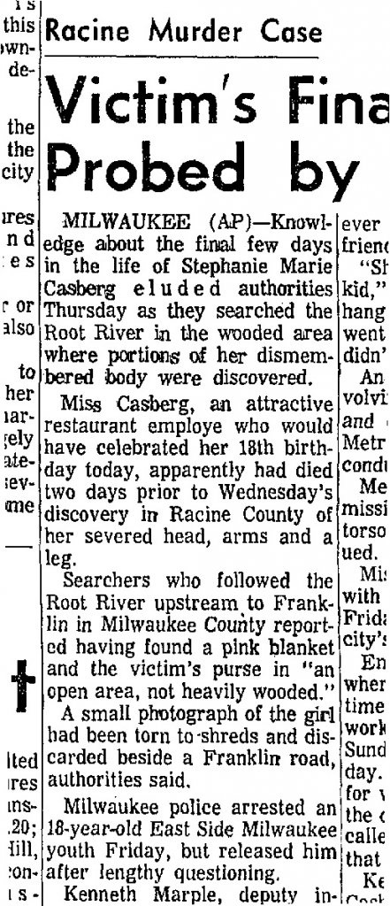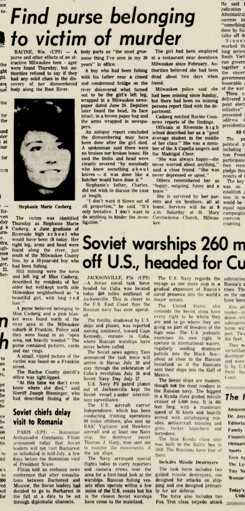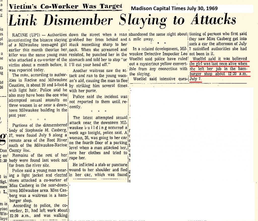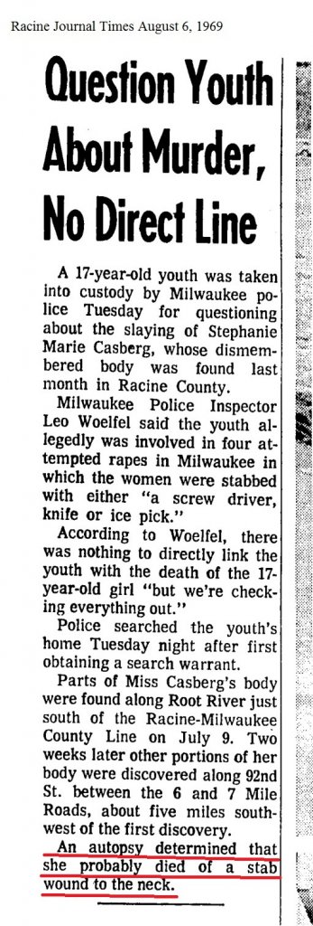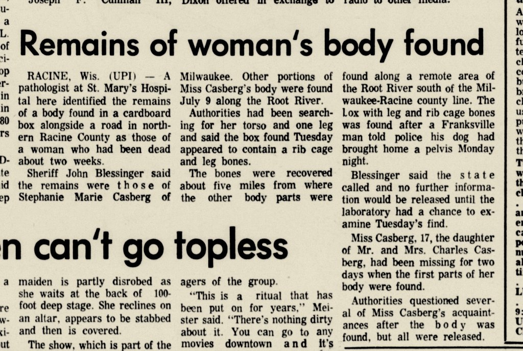 Stephanie was missing since Sunday, July 6, and was found Thursday, July 10. The Kenosha News, July 11, 1969 stated, "Authorities believed she had been dead two days when found."