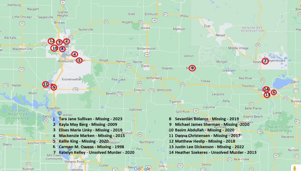 It would be helpful if authorities said exactly when and where her phone was found in Ringle and where exactly her vehicle was found on Hwy 29 in Shawano County. This would help pinpoint the locations for potential witnesses to recall if they saw something suspicious in a specific area. The 50 miles between Weston and Shawano is a pretty big area. I can't understand the delay in releasing information, especially in this area where so many missing person cases have gone cold and murders have gone unsolved. The ones below are only recent samples.