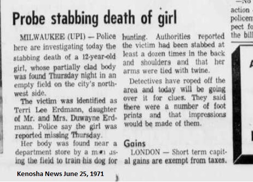 On Thursday, June 24, 1971, Terri Lee Erdmann, age 15, was found in a wooded area north of the Northwestern Road railroad tracks, east of Appleton Ave, and south of the Little Menomonee located behind the old Moreway building located on the corner of West Appleton Ave (Highway 175) and West Carmen Ave., Milwaukee, WI. Her body was lying face down in a thicket of small trees and tall grass 200 feet north of the right of way and about a quarter mile from Appleton Ave. (If you follow the high tension wire in from Appleton Ave to the third high tension wire tower and made a left about 200 feet that would be the approximate location)