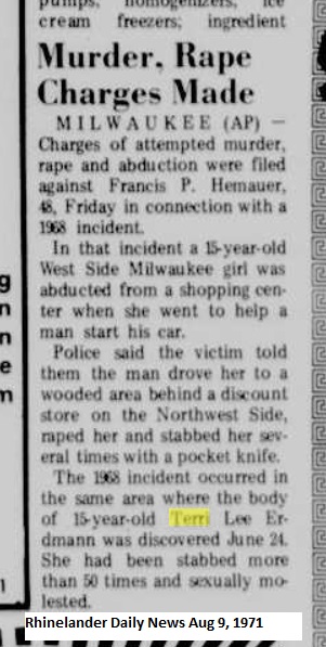 The August 9, 1971 Rhinelander Daily News reported that a man was charged with a similar crime at the same location that Erdmann was found. Francis P. Hemauer, 48, was charged with attempted murder, rape and abduction with a 1968 incident. The 15 year old West Side Milwaukee girl was abducted from a shopping center when she went to help a man start his car. He drove her to the same area Erdmann was found, where he raped her and stabbed her several times with a pocket knife.