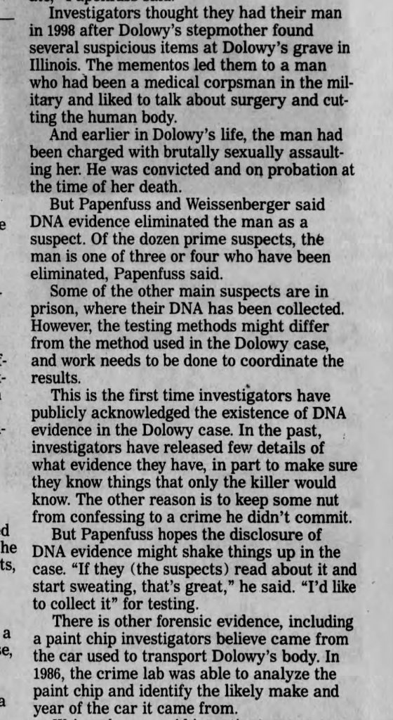I came across this unsolved case when browsing tonight. I had not heard of this one and I am in Wisconsin. It is very interesting. Terry Dolowy, 24 went missing, 4 days later her headless body was found burning in a ditch. The articles at the link start out in 1985 up to 2001 I believe. They were in 2001 discussing DNA evidence. Her little white poodle named Suzie disapeared with her. I am gonna go search to see if I can come up with more current info. Here is the link for the articles.
