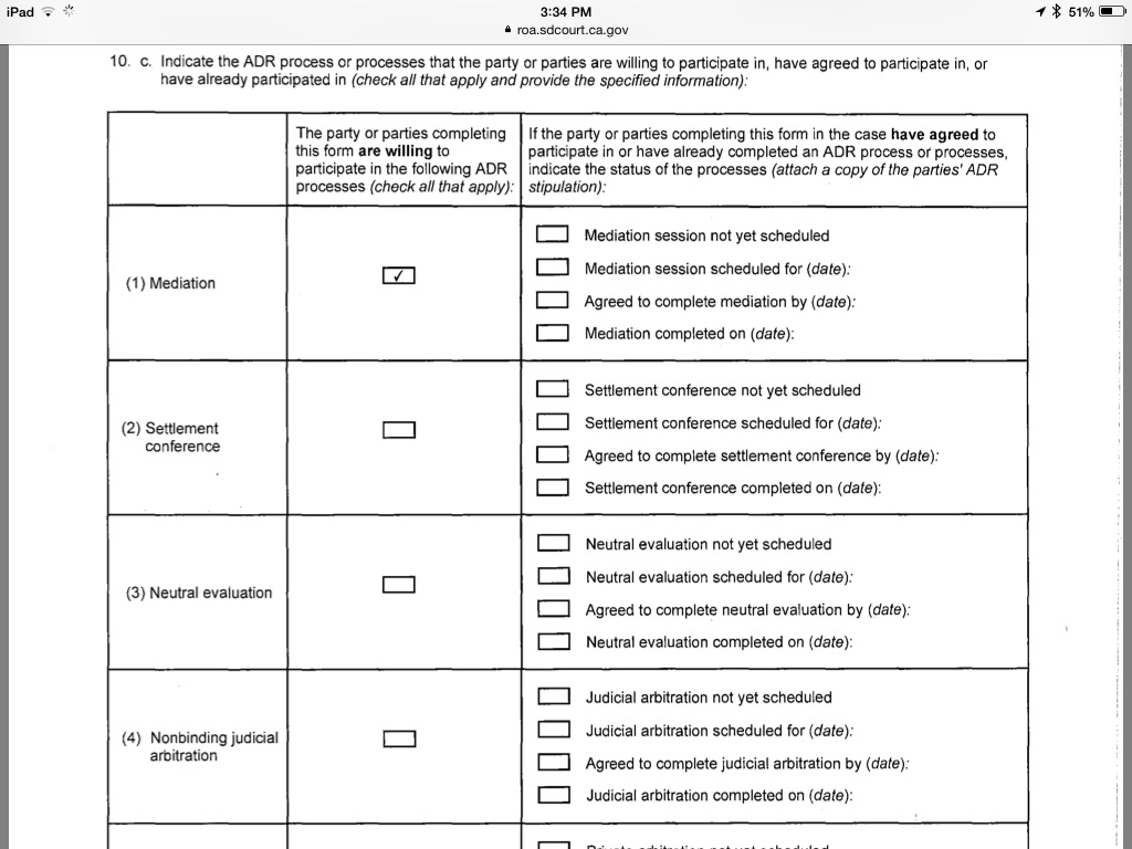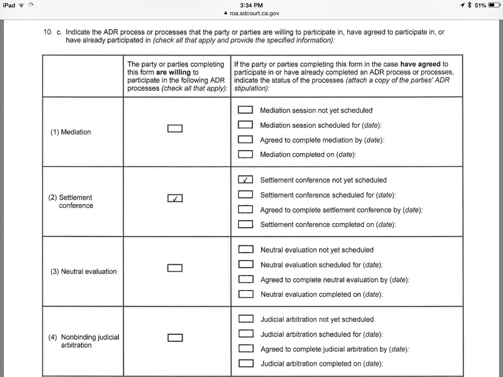 It is pretty clear from the Federal Joint Case Management Statement Report, "The parties have come to the conclusion that no ADR process is likely to deliver benefits sufficient to justify the resources committed to its use, and this case should be exempted from participating in any ADR process". A document filed jointly by ALL parties.