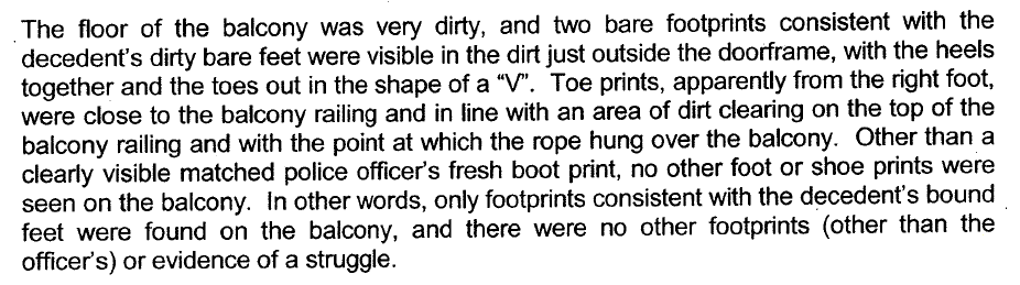 As for AS tossing her over the railing like a basketball, well that doesn't work quite right either. If we take in her size and what his size is reputed to be, it wouldn't be all that difficult for him to hold her limp form over the balcony, touch her feet to the ground a couple of times and send her over, even without exiting the room. That would also lend credence to the fact that her neck injuries were inconsistent with a long drop hanging.