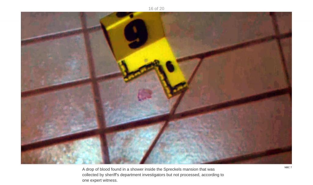 There was another drop of blood found in a shower on the property. DiMeo testified that sheriff's homicide investigators collected the blood sample but did not process it.