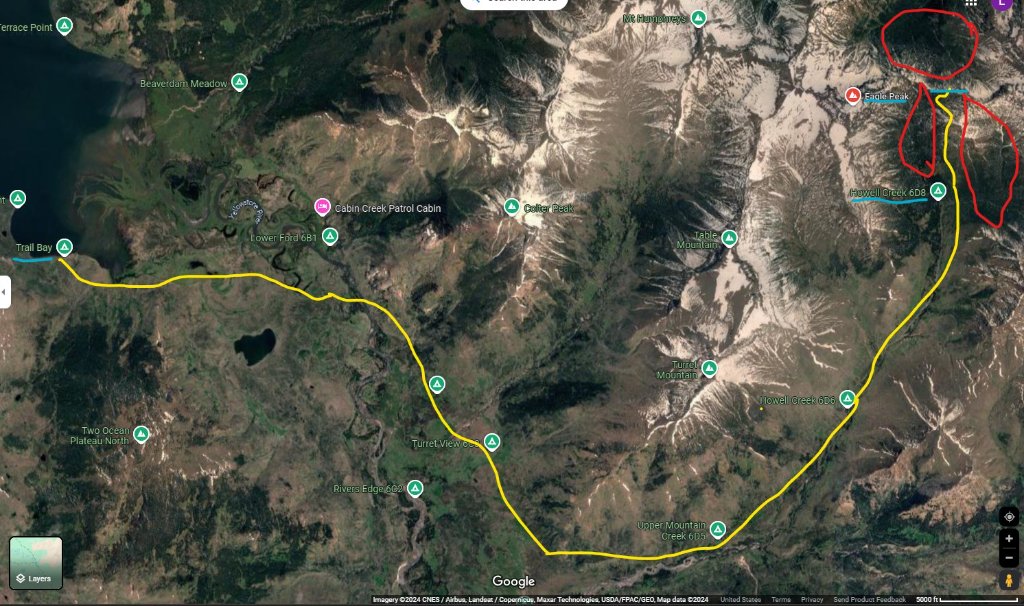 The one thing I noticed while using this satellite map, is there is no way back to Yellowstone Lake to the North. The range that includes Eagle Peak just keeps going. If he got lost, I just hope he has a compass to keep his bearing.