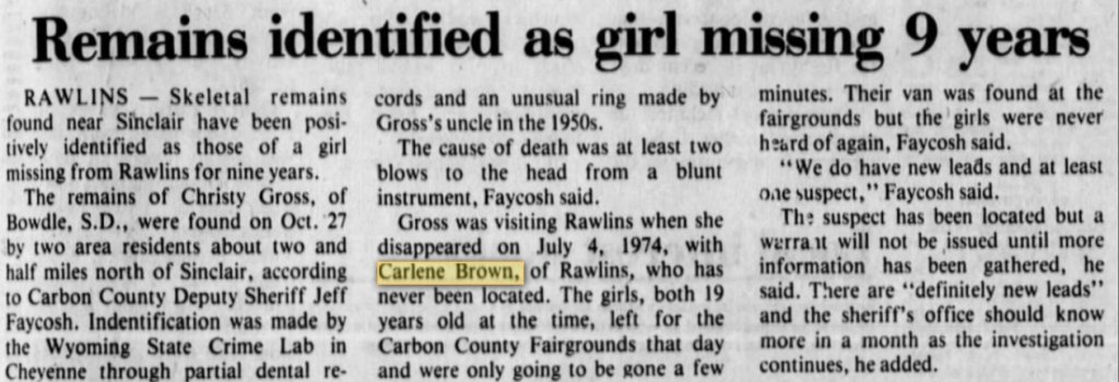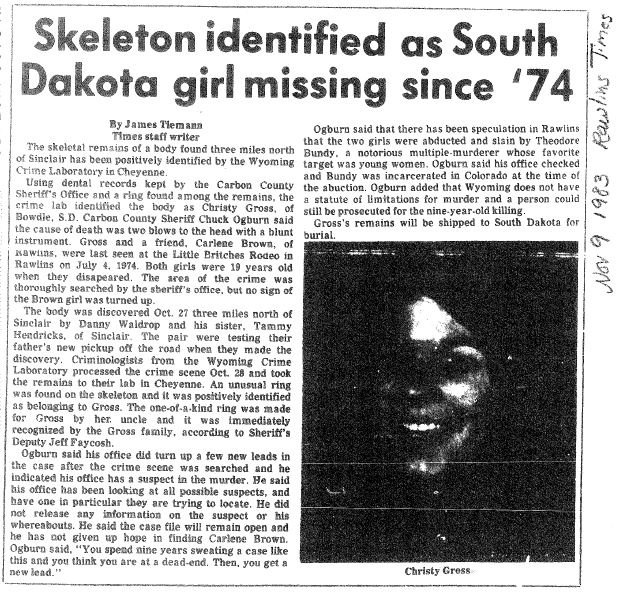 If anyone is interested, I am attaching the article I copied from Wyoming State archives about remains being positively identified as Christy Gross, the young lady who went missing with Carlene Brown.View attachment 123890