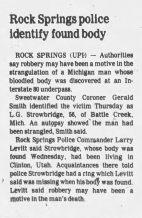 This is amazing, where did you find this article? I could find nothing on L.G. Strowbridge.On July 1st, 1981, the body of Lee G. Stowbridge, a transient traveling to Michigan, was found under the eastbound land of the I-80 at exit 107 (Pilot Butte). He was a homicide victim. This is about four miles from exit 111 (Airport/Baxter Road) and this case remains unsolved.