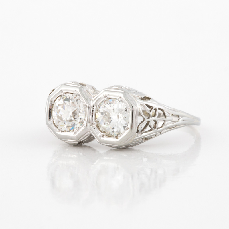 I poked a bit at the other ring. That general style of two-stone ring seems to have been popular as an engagement or cocktail ring around the art deco-Edwardian period. But I don't see anything really close to this lady's ring and I'm not expert enough to know whether it's actually vintage or just a generic ring.