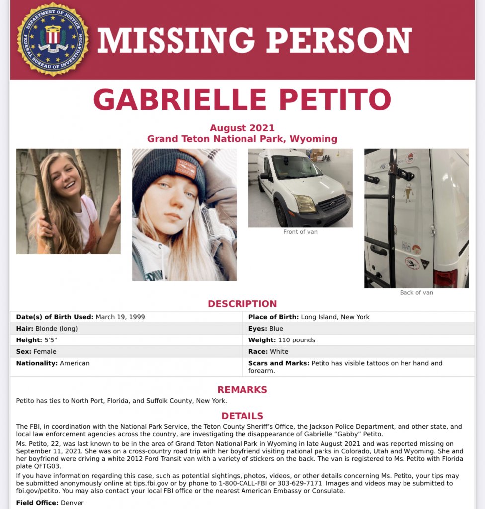 The FBI, in coordination with the National Park Service, the Teton County Sheriff’s Office, the Jackson Police Department, and other state, and local law enforcement agencies across the country, are investigating the disappearance of Gabrielle “Gabby” Petito.