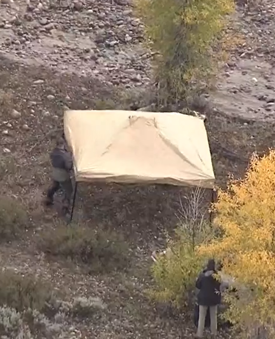 ...and I think the body actually appears to be offscreen from the footage of setting up the canopy. At the end of some of the videos, once the canopy is set up, the men that were previously huddled all immediately walk off in a specific direction.