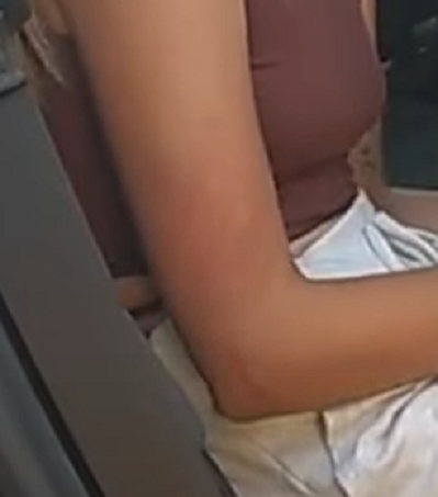 I also think that there is a redness on her right arm, just above the elbow that looks like pressure marks from a hand grab. It's faint and seems to only start appearing later on. My guess is she would have had bruises there in a few hours. But YMMV.