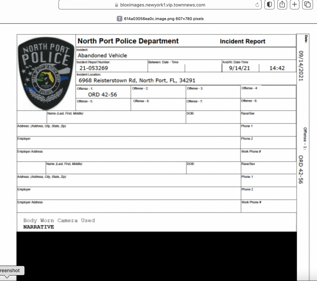 9/14 - NPPD police report related to an abandoned vehicle at 6968 Reisterstown Road, which is the location of Myakkahatchee Creek Environmental Park. (Source: Your Sun.)