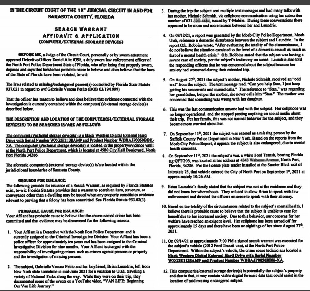 WPTV obtained a copy of the search warrant, which states police needed to look through an external hard drive found inside a silver Ford Mustang at Laundrie's home, as well as text messages where Petito [Gabby] indicated growing tensions with Laundrie in conversations with her mother.