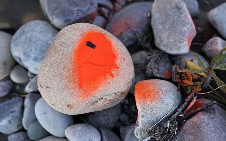 Well, someone posted earlier that they were markers for a 3D reconstruction to be used at future trial - and I would expect that the black marks on the rocks were to denote that particular position needed to be scanned - the orange probably indicates that it was scanned.