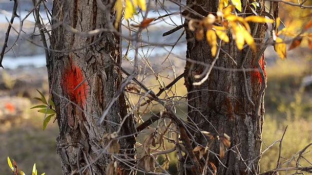 They bring a scanner in to scan the general area, using grid markers and GPS, then they put in the points of interest to the particular crime. So, I believe the rocks probably indicate the area (for example) where Gabby's head may have been. I am not sure that the holes in the trees are meaningful to this crime, but they would have gone ahead and scanned some points merely out of possible interest. I'm linking an article below that shows the forensic use and I've asked a couple of colleagues who use this technique in archaeology to comment on what they think it could mean (they don't use orange paint, they use metal markers that are removable from the scene, but paint would be easier).