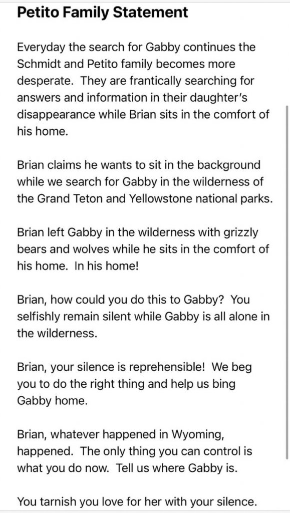 "As a father, I can imagine the pain and suffering Gabby's family is going through," North Port Police Chief Todd Garrison said. "We are pleading with anyone, including Brian, to share information with us on her whereabouts in the past few weeks. The lack of information from Brian is hindering the investigation. The answers will eventually come out."