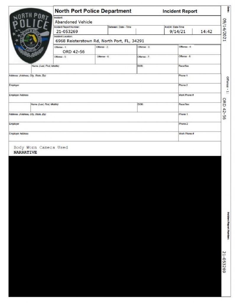 This is the North Port PD abandoned vehicle report related to the Mustang at the Carlton Reserve.