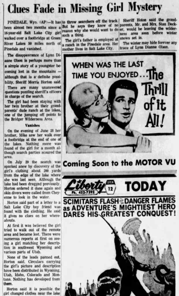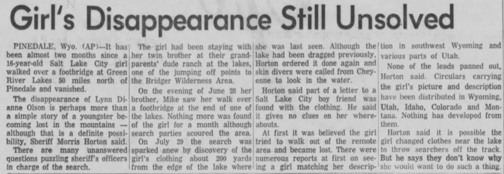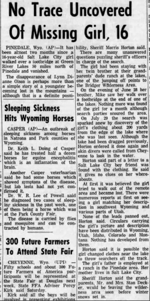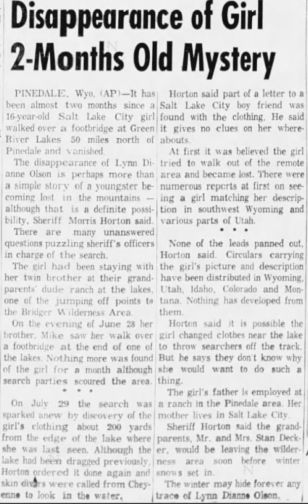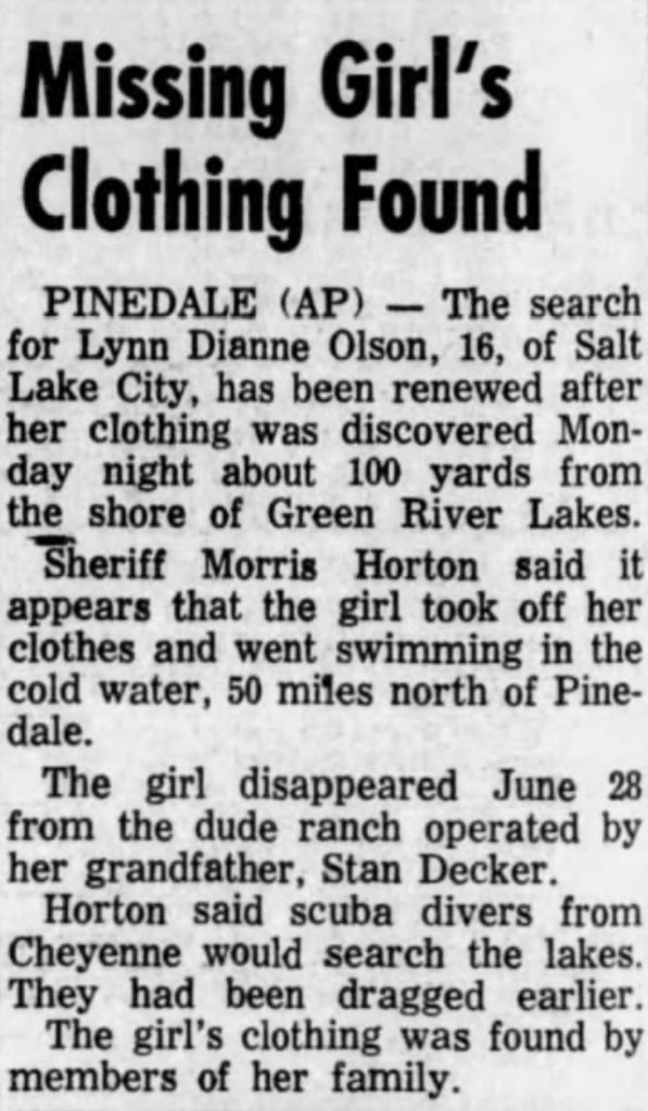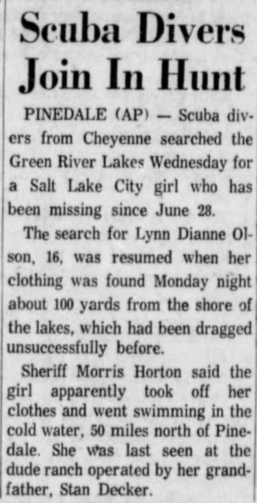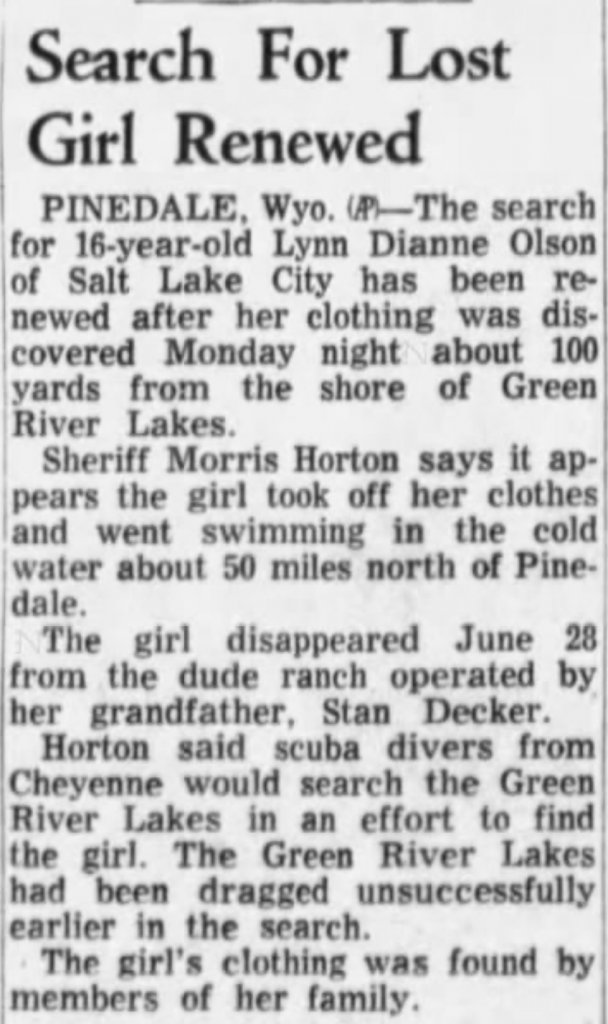 Agreed. It seems strange to me that her glasses and clothes were found so close to home a full month after her disappearance. And while they may have been near to the lake, I really can't imagine someone swimming in that water in June. They were still getting snow. Even by the end of July, the lake water temperatures were only 48 degrees F. That's so cold! I was so sure no one would choose to swim in that. However, I did find photos of guests swimming in the lake in this pdf of historical photos and pamphlets: https://www.sublette.com/preservati...y SCRAPBOOK scan - SCHPB 10-26-2017-small.pdfA girl who has very bad vision would be unlikely to leave her glasses behind voluntarily. I wonder if her clothes were folded and stacked, or scattered. I'd be wondering who else was staying at the dude ranch.