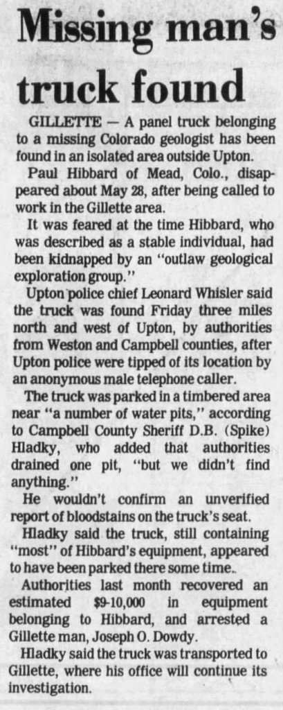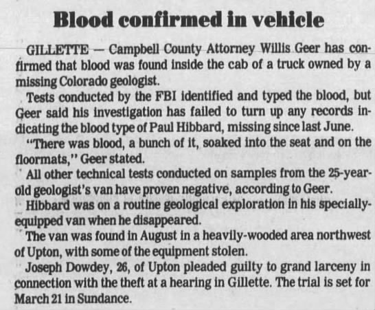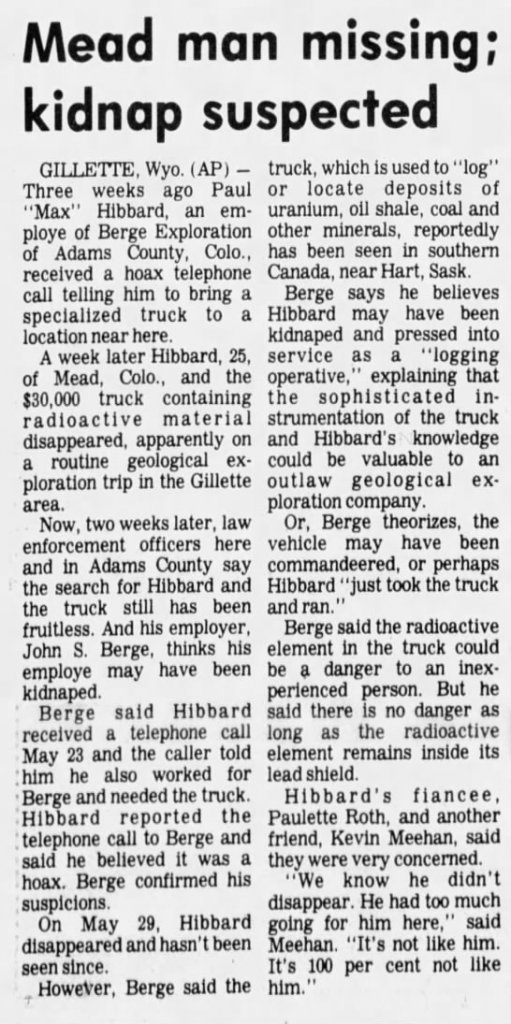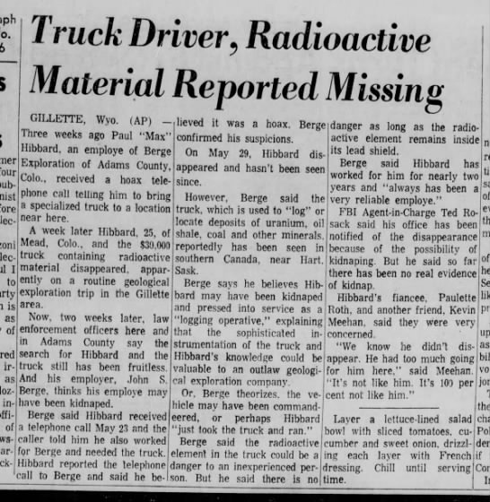 On May 28, Hibbard was on a routine geological exploration trip in the Gillette area driving the van which contained $30,000 in radioactive material. He has never been heard from again.