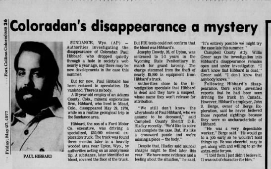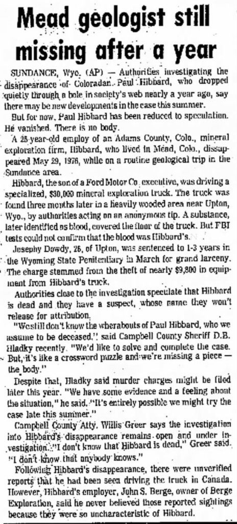 Hibbard was last seen in Gillette, Wyoming on May 28, 1976. He was a geologist from Mead, Colorado and worked for Berge Exploration, a company in Adams County, Colorado. He had worked there for two years and was considered a reliable employee.