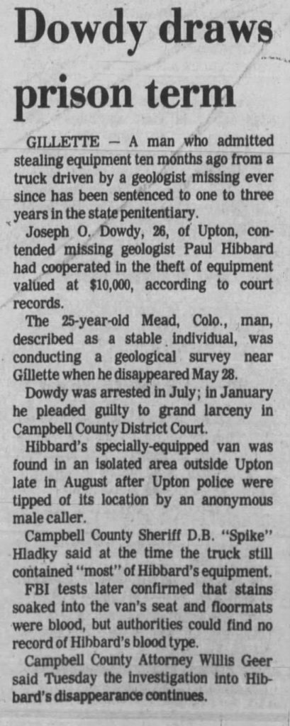 In July, police located almost $10,000 worth of Hibbard's geological equipment in the possession of an Upton, Wyoming resident, Joseph O. Dowdy, when he was caught trying to sell the equipment. He was questioned in Hibbard's disappearance, but didn't provide any firm leads as to his whereabouts. Dowdy was eventually arrested and charged with grand larceny.