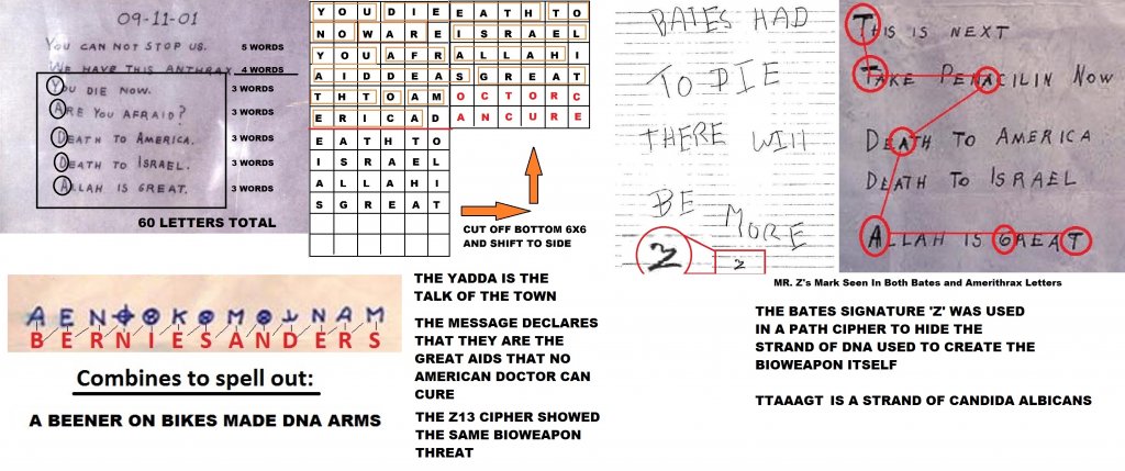 Noticing the likeness to these ciphers is one thing, but finding this info from the Z13 Cipher revealing that A BEENR ON BIKES MADE DNA ARMS you later see the same type of declaration in the Amerithrax Letter when it says YOU DIETH TO NO WAR E ISRAEL YOU AFRICAN ALLAH I AIDDES GREAT THT NO AMERICAN DOCTOR CAN CURE.