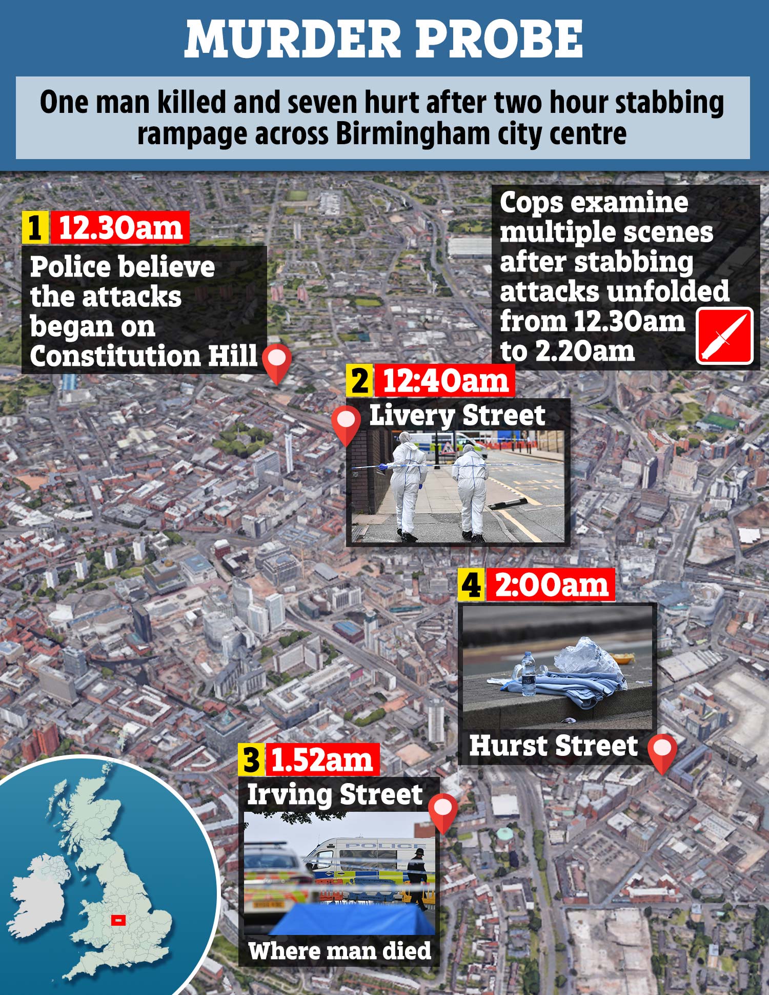 ''A man was killed and seven people injured in late-night stabbings in a busy nightlife area of the central England city of Birmingham, police said Sunday.