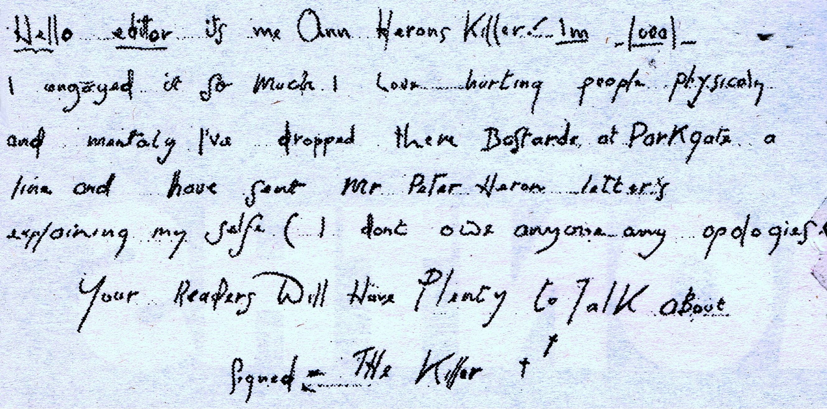 Ann Heron's body was found in a pool of blood in her living room in Darlington on 3 August 1990, after sunbathing at the nearby Aeolian House.''