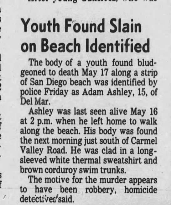 On May 17, 1979, at approximately 0740 hours, a citizen riding his bike in the area discovered the body of 14-year-old Adam Ashley just above the surf line on Torrey Pines State Beach. The area was described as .5 miles south of Carmel Valley Rd. near lifeguard tower number 4. During the...