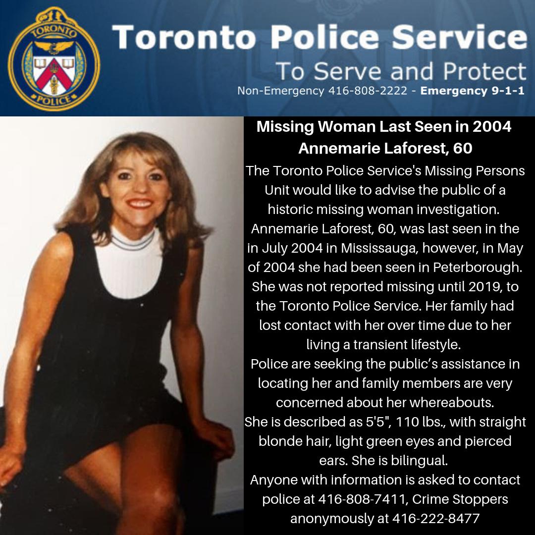 Annemarie Laforest, 60, was last seen in the in July 2004 in Mississauga, however, in May of 2004 she had been seen in Peterborough. She was not reported missing until 2019, to the Toronto Police Service. Her family had lost contact with her over time due to her living a transient lifestyle.