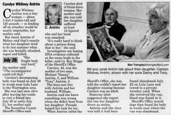 On July 27, 2007, a body was found in the wooded area just west of the dead end of Lola Lane, in Escambia County, Florida. The victim was later identified as Carolyn Whitney Antrim, who had been reported missing by her mother, Janet Antrim, on that same day, but she advised that her daughter (Carolyn Antrim) had not been seen since July 20, 2007. The van that the victim was last known to be driving had been towed as an abandoned vehicle on July 21, 2007. The family did not recover the van until July 27, 2007, at which time a family friend noticed blood in the van.