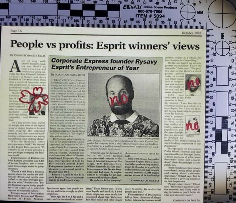 Do you all remember this bizarre piece of evidence? A magazine article was found at the Ramsey house, featuring a picture of John and three other business men. What was particularly odd about the article is that someone scribbled in red ink on it, crossing out the faces of the other men with "No" and drawing what was described as "a crude heart with flowers" around John's face.