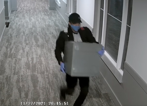 The suspect — dressed in black, with a face mask obstructing his face — emerged 90 minutes later, and can be seen in security footage running down a hallway, carrying a safe.
