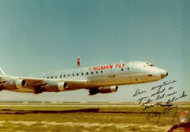 In the early 1970s, Rojatt teamed with famous US pilot Clay Lacy to ride atop a four-engine Douglas DC-8.